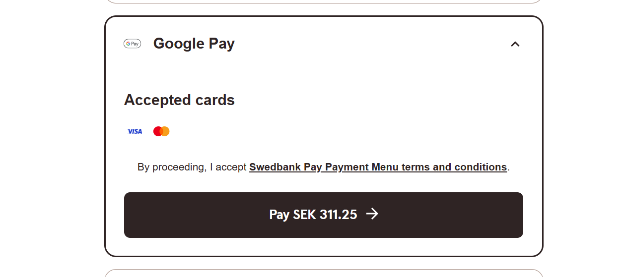 Any merchant onboarded with Swedbank Pay who’s been given access to Google Pay™ can request the payer to provide a billing address in relation to shipping them physical goods. These details are encrypted and can only be accessed by the merchant that requested the billing details and are deleted after 30 days.